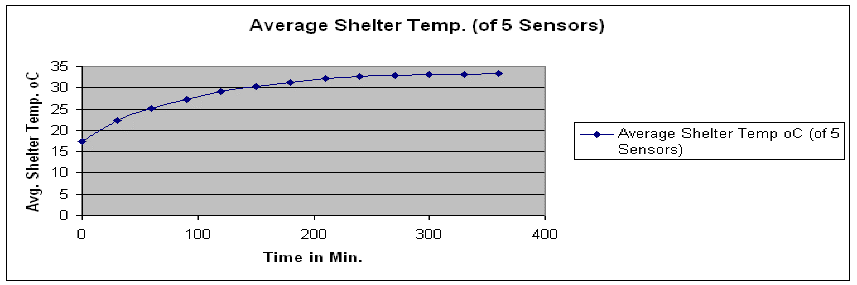 210 Kg of Latest29T PCM (10KWH) filled profiles were installed in an Existing Telecom Shelter of 2m Length by 2.5m width by 2.7m Height. Five thermometers were installed to measure temperature at various points. The Air-condition was switched off when the temperature was 17.3°C. Ambient temperature was also measured. The battery voltage was observed as per the instruction of the site-officer. The permissible maximum temperature that can be reached was targeted to 35°C. This temperature was not reached in 6 Hours of the run. In a blank reading with-out Latest29T PCM the target maximum temperature crossed in less than 1 hour.
